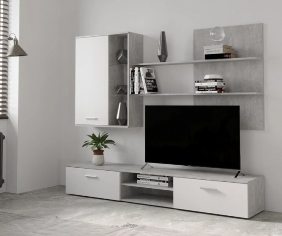 Стінка Кватро Гербор – меблевий комплект із сучасними тенденціями в дизайні від української меблевої фабрики Gerbor – холдинг, для облаштування інтер'єру вітальні. Корпус та фасади виготовляються з якісного ламінованого ДСП, у поєднанні кольорів «бетон ательєр / німфея альба з полицями бетон ательєр». Меблі Кватро Gerbor характеризуються практичним кольоровим рішенням із простими геометричними формами; зручними довгастими ручками, сріблястого кольору.