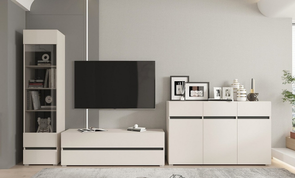 Сучасна стінка Лондон 1 Gerbor, що поєднує лаконічну естетику, функціональність і продуманий комфорт, гармонійно впишеться в інтер'єр вітальні, надаючи простору стриману елегантність і відчуття порядку. Корпус і фасадні частини виготовлено з якісної ламінованої ДСП товщиною 16 мм, задні стінки і дно шухляд виготовлено з ДВП сірого кольору товщиною 3 мм, що підтримує єдиний стиль оформлення навіть у непомітних деталях. Колекція виконана в поєднанні теплих і холодних відтінків «кашемір» і «антрацит», створюючи атмосферу європейської витонченості, де світлі поверхні дарують відчуття простору і свіжості, а темні деталі акцентують увагу на чіткій геометрії форм. Меблі привертають увагу сучасним мінімалізмом з продуманою ергономікою, простими формами і чіткою геометрією, м'яким поєднанням теплих і холодних відтінків, відсутністю звичних ручок, замінених витонченими фрезерованими виїмками, що надають фасадам чистоти ліній і оригінальності, а також практичними пластиковими ніжками Etera Plast і якісною фурнітурою - кульковими напрямними повного висування HAFELE і петлями SLIDE-ON HETTICH, що забезпечують плавність і надійність у роботі. Стінка Лондон Gerbor включає різноманітні елементи: місткий комод з легкістю впораються зі зберіганням одягу і дрібниць, елегантна вітрина ефектно підкреслять посуд або колекційні предмети, ТВ-тумба продумана до дрібниць, щоб органічно вписатися в мультимедійний простір. Усі модулі продаються поелементно, що дає змогу гнучко компонувати меблі залежно від особливостей простору й особистих уподобань. Завдяки такому підходу, ви можете створити інтер'єр, який не просто відображає ваш смак, а й ідеально відповідає вашим потребам. Лондон Gerbor - створена для тих, хто прагне до спокійного і затишного будинку, наповненого світлом, простором і стилем, де кожне повернення стає справжнім задоволенням. Купити стінку Лондон Gerbor можна в нашому інтернет-магазині ProMebli.ua з доставкою по всій Україні. Оплата за готівковий і безготівковий розрахунок у кредит, розстрочку або оплату частинами ПриватБанку.