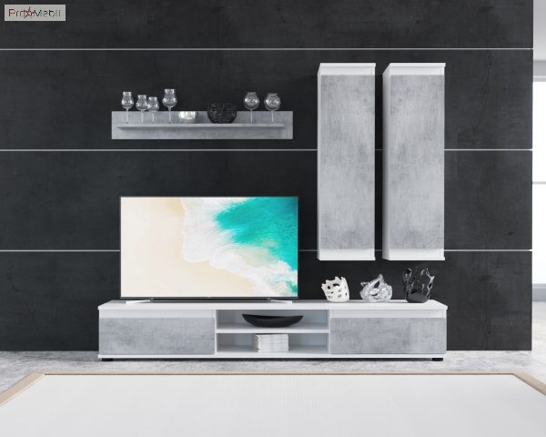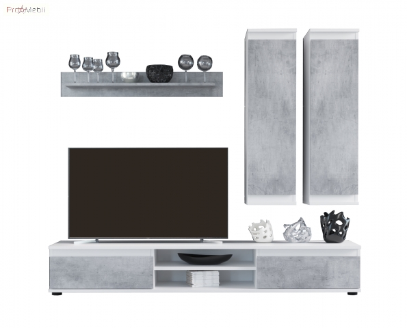 Стінка Люсія 175 Гербор – елегантний меблевий комплект із сучасними тенденціями в дизайні від української меблевої фабрики Gerbor – холдинг для облаштування інтер'єру вітальні. Корпус і фасади виготовляються з якісного ламінованого ДСП, у поєднанні кольорів «німфея альба» зі ставками кольору «бетон». Меблі Люсія Gerbor характеризуються стильним лаконічним дизайном; простими геометричними формами; сучасним поєднанням кольорів; відсутністю ручок, їх роль виконують фрезеровані на фасаді виїмки.