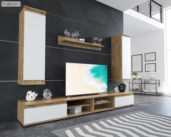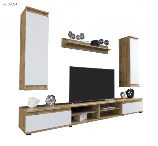 Стінка Люсія 220 Гербор – елегантний меблевий комплект із сучасними тенденціями в дизайні від української меблевої фабрики Gerbor – холдинг для облаштування інтер'єру вітальні. Корпус і фасади виготовляються з якісного ламінованого ДСП, у поєднанні кольорів «дуб тахо» зі ставками кольору «німфея альба». Меблі Люсія Gerbor характеризуються стильним лаконічним дизайном; простими геометричними формами; сучасним поєднанням кольорів; відсутністю ручок, їх роль виконують фрезеровані на фасаді виїмки.