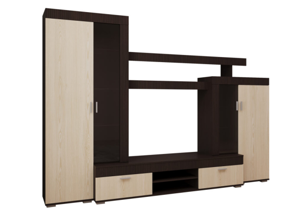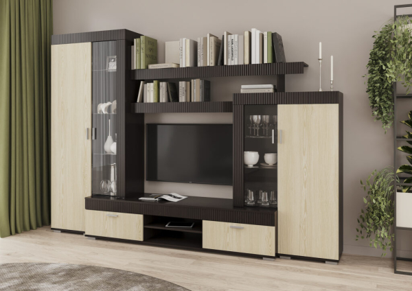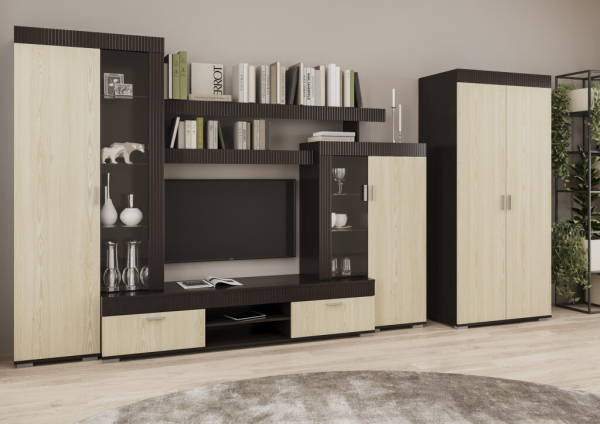 Гарнітур у вітальню Марк Сокме - стильна і сучасна цілісна конструкція від фабрики Сокме, для облаштування сучасної вітальні. Корпус і фасадні частини виготовлені з якісного ламінованого ДСП товщиною 16 мм з декоративними рифленими вставками з МДФ, в цікавому поєднанні кольорів венге магія і дуб родос. Торцеві поверхні всіх внутрішніх і зовнішніх елементів виробів облицьовані крайкою ABS товщиною 0,5 мм, надаючи меблям завершений красивий і доглянутий вигляд. Гарнітур привертає увагу елегантним мінімалістичним стилем; поєднанням двох відтінків; прямими чіткими лініями; довгастими пластиковими ручками; пластиковими ніжками; фірмовими комплектуючими: телескопічними напрямними і завісами без дотягу, які забезпечують максимальний комфорт у використанні.