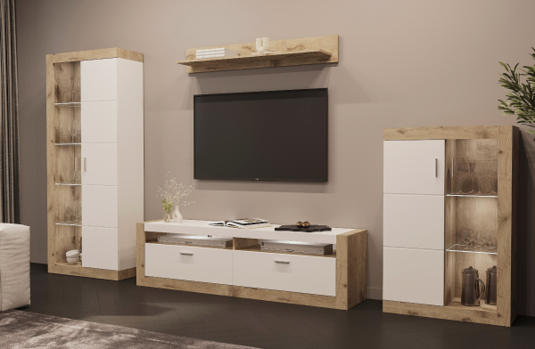 Стінка Палермо біла Сокме - сучасна колекція, що поєднує стиль і функціональність в єдиному витонченому образі, який додасть вітальні атмосферу легкості і сучасного шарму. Корпус виготовляється з високоякісного ламінованого ДСП товщиною 16 мм і 18 мм, фасади з ламінованого МДФ товщиною 16 мм, в гармонійному поєднанні білого з фактурою натурального дерева в відтінку «дуб вікінг». Всі торцеві поверхні деталей акуратно облицьовані кромкою ABS товщиною 0,5/1 мм, що забезпечує довговічність і акуратний зовнішній вигляд. Стінка зачаровує: стильним сучасним дизайном; горизонтальним фрезеруванням фасадів; витонченими сріблястими ручками; міцною основою, що забезпечує стійкість конструкцій; високоякісною фурнітурою. Стінка складається з: високої і низької вітрини, тумби під телевізор і навісної полиці. Всі модулі об'єднані єдиним дизайном, завдяки чому інтер'єр виглядає цілісно і сучасно. Палермо Сокме - меблі, які підкреслюють смак, створюють затишок і надихають кожен день. Купити стінку Палермо біла Сокме можна в нашому інтернет-магазині ProMebli.ua з доставкою по всій Україні. Оплата за готівковий і безготівковий розрахунок, в кредит і розстрочку.