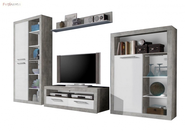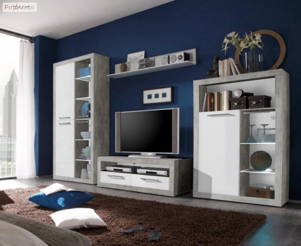 Стінка Стелла ВМК – Україна (БРВ) – оформлені в сучасному стилі меблі у вітальню від української фабрики ВМК – Україна. Корпус виготовляється з ламінованого ДСП, фасади із МДФ у незвичайному поєднанні природної текстури, що імітує бетон, та білого глянцю. Гарнітур вражає своїм сучасним дизайном; природною грою тонів та відтінків; застосуванням нових текстур, які вдало підкреслює ефектне підсвічування; довгастими ручками, сріблястого кольору.