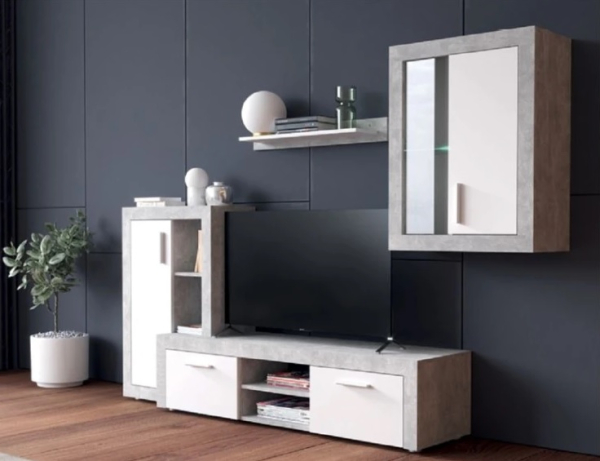 Стінка Тера ВМК - Україна (БРВ) - елегантне рішення для вашої вітальні. Гарнітур привнесе в інтер'єр індивідуальність і створить атмосферу сучасного комфорту. Виготовляється з ламінованого ДСП у кольорі: «бетон / німфея альба», створюючи ефектний контраст і надаючи кімнаті легкості та простору.