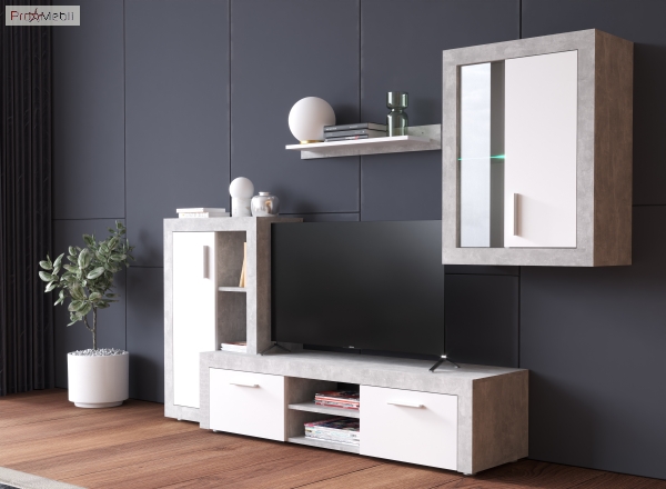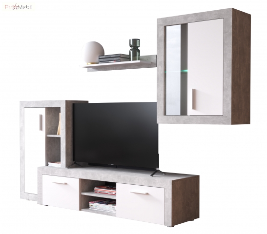 Стінка Тера ВМК – Україна (БРВ) – невеликий набір меблів у вітальню від української фабрики ВМК – Україна. Корпус та фасадні частини виготовляються з ламінованого ДСП у незвичайному поєднанні корпусу з природною текстурою, що імітує бетон із фасадами у кольорі німфея альба. Стінка вражає своїм сучасним дизайном; практичністю, функціональністю та гарною місткістю; застосуванням нових текстур, які вдало підкреслює ефектне підсвічування; довгастими ручками, сріблястого кольору.