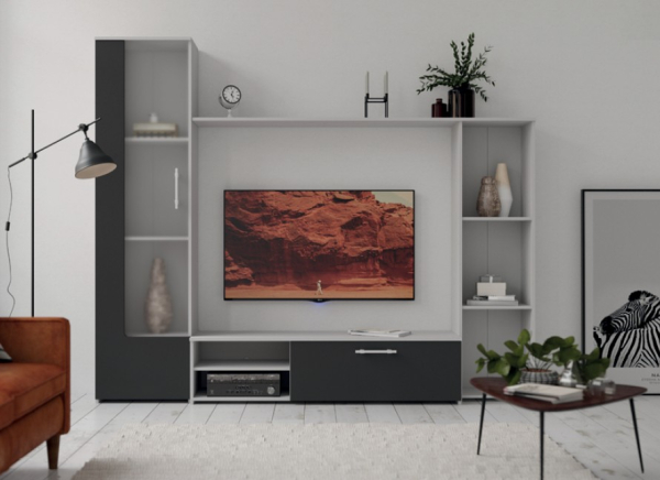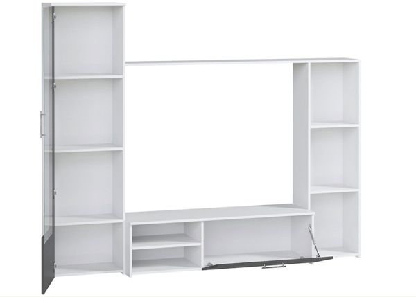 - тумба під телевізор з відкидними дверцятами, усередині якої одне відділення і дві відкриті ніші для зручного зберігання і розміщення техніки;
