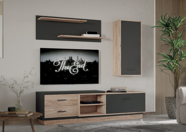 - тумба під телевізор - 1 шт. - з двома просторими висувними шухлядами для зберігання, одним закритим відділенням з відкидними дверцятами і відкритими полицями для розміщення електроніки або декоративних елементів;