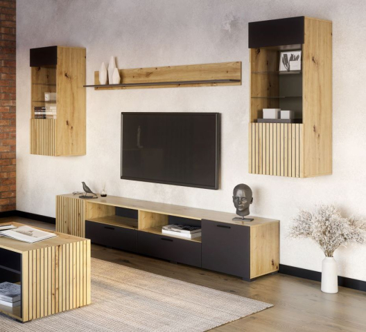 Стінка Зара Світ Меблів - чудовий стильний набір, у якому гармонійно поєднуються елементи сучасного, лофтового та індустріального стилю, створюючи затишний і сучасний простір у вітальні, сповнений динамікою і натхненням. Особливої чарівності стінці надають виражені на фасадах вертикальні планки з шовкографії; контрастне поєднання відтінків, теплий відтінок «дуб артізан» з його природною текстурою гармонійно поєднується з глибоким насиченим «антрацитом»; два варіанти відкривання - продовгуваті ручки на одних фасадах та сучасна система Push to Open на інших; надійна фурнітура, що забезпечує плавність і комфорт в експлуатації. Стінка складається з: навісних вітрин, які додають простору легкість і дасть змогу ефектно розмістити улюблені аксесуари, ТБ-тумби, що стане стильною та функціональною основою для зони відпочинку, і відкритої полиці, яка допоможе розставити акценти, додаючи затишку та індивідуальності. Меблі Зара Світ Меблів створять затишний і продуманий простір, де кожна деталь сприяє створенню гармонійного й сучасного інтер'єру, сповненого комфортом і атмосферою тепла, в якому приємно відпочивати й проводити час. Купити меблі Зара Світ Меблів можна в нашому інтернет-магазині ProMebli.ua з доставкою по всій Україні. Оплата за готівковий і безготівковий розрахунок, у кредит і розстрочку.