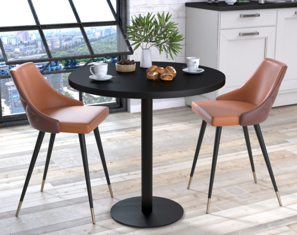 Обідній стіл круглий BS-450-800 - це традиційний стіл на одній ніжці та важкій основі. Якийсь час тому такі столи можна було побачити лише в кафе. Але оскільки однією з головних тенденцій сучасного світу є рух у бік функціональності, столи з однією ніжкою стали все частіше купувати додому або в офіс. Круглі столи зручні тим, що за нього можна сісти з будь-якого боку, при цьому в цій моделі ніжки не заважатимуть тим, хто сидить. За таким столом люди більшою мірою звернені один до одного, що сприяє спілкуванню і більш відвертій бесіді. Опора столу складається з основи, круглої ніжки та кріплення до стільниці. Ці речі поставляються окремо, що здешевлює та полегшує доставку. Основа виготовляється з листового металу товщиною 8 мм. Завдяки великій вазі та ширині 450 мм основа надійно тримає конструкцію зі стільницею шириною до 800 мм. Ніжка виготовлена з круглої труби діаметром 60 мм та товщиною стінки 2 мм. У верхній частині опори є кріплення до стільниці також зроблене з листового металу товщиною 4 мм. Стільниця столу виготовлена із здвоєного ДСП завтовшки 36 мм. Забарвлення ДСП мають виражену дерев'яну текстуру, завдяки якій стіл виглядає дорого та натурально. По краях вона обклеєна двоміліметровою кромкою ПВХ. Зверніть увагу, що цей стіл треба захищати тривалої дії рідини або високих температур. Рекомендуємо використовувати підставки чи підкладки під предмети. Увага: Стільці не входять у комплект зі столом!