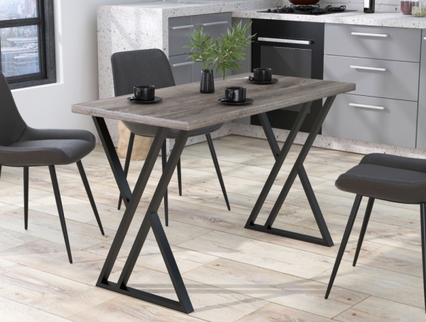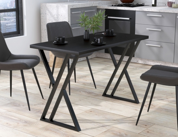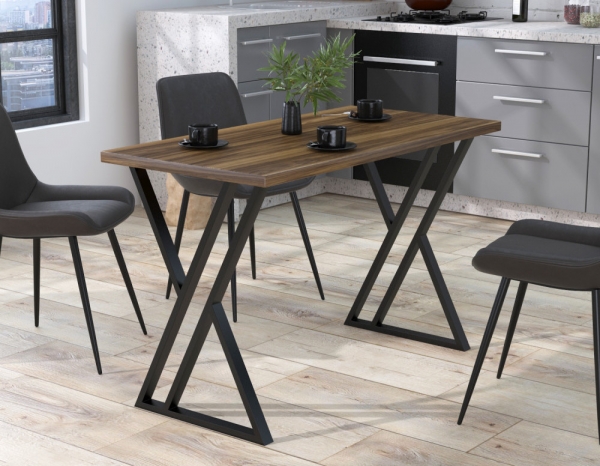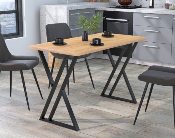 Обідній стіл Уолес від компанії Loft Design виконаний у стилі Лофт у самому класичному розумінні: незвичайні металеві ніжки поєднуються з масивною стільницею з красивою текстурою дерева, що імітує дорогі породи. Оригінальна конструкція ніжок виглядає дуже стильно свіжо. Цей стіл підійде для будь-якої сучасної кухні. Незважаючи на свої значні розміри, стіл виглядає елегантно та стильно. Ніжки виготовляються з труби профілем 40х20 мм. Вгорі ніжки є широка пластина розміром 520х150 мм, що забезпечує надійне кріплення опори до стільниці і стійкість столу в цілому. Стільниця виготовлена із здвоєного ламінованого ДСП. Розмір стільниці 120х65 см, товщина 36 мм. Зверніть увагу, що цей стіл треба захищати від тривалої дії рідини або високих температур. Рекомендуємо використовувати підставки або підкладки під предмети. Увага: Стільці не входять у комплект зі столом.