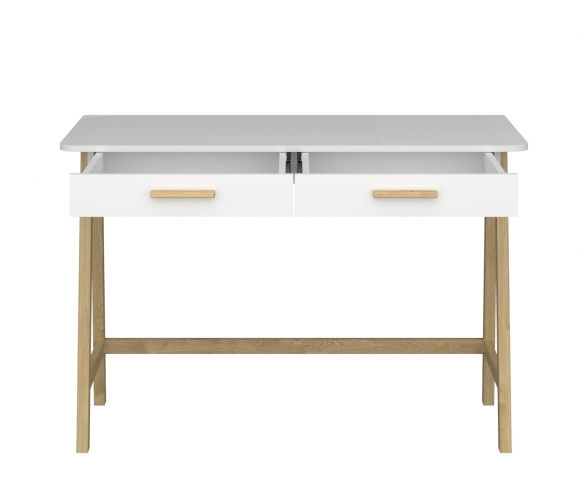 Чарівний стіл письмовий 2S/120 Бель біла ВМВ, яка впишеться практично в будь-який інтер'єр молодіжної кімнати та домашнього кабінету, ставши джерелом натхнення і надавши інтер'єру оригінального характеру. Стіл містить дві висувні шухляди. Меблі привертають увагу своїм неординарним дизайном та цікавою формою; незвичайною асиметричною композицією; первозданним білим кольором; подовженими зручними ручками і високими ніжками, що виступають з боків, виготовленими з натурального дерева; фірмовими комплектуючими. Колекція Belle VMV порадує всіх любителів інноваційних ідей, а також сучасних, оригінальних та елегантних інтер'єрів, тих, хто цінує розкіш та комфорт у своєму будинку.