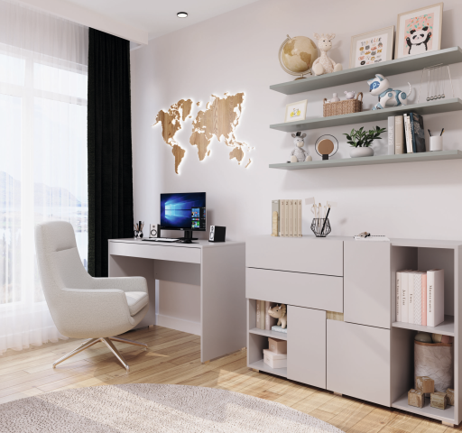 Письмовий стіл 1000 Маріо Світ Меблів втілення м'якої гармонії та сучасного стилю, де затишок поєднується з функціональністю, створюючи зручний і збалансований простір, який підходить як для кімнати дівчинки, так і для кімнати хлопчика. Стіл містить одну висувну шухляду, яка забезпечує зручне зберігання канцелярії та необхідних дрібниць, зберігаючи робочий простір акуратним і організованим. Меблі поєднують в собі продуману простоту і елегантність: строгі, але м'які лінії і гладкі фасади без зайвих деталей створюють відчуття чистоти і легкості; нейтральна палітра відтінків візуально розширює простір, наповнюючи його світлом і спокоєм; відсутність звичних ручок надає меблям особливу легкість і сучасність, відкривання реалізовано за допомогою системи Push to Open, що забезпечує плавне відкриття легким натисканням, підкреслюючи продуману естетику колекції; витончені опори надають конструкції легкість і стійкість, а якісна фурнітура забезпечує високий рівень комфорту, підкреслюючи збалансований, продуманий характер колекції. Дитячі меблі Маріо Світ Меблів створюють простір, де кожен елемент сприяє розкриттю особистості дитини, надихаючи її на творчість, ігри, відпочинок і пізнання світу, перетворюючи кімнату в затишне, живе і гармонійне місце для розвитку, фантазії і щоденного комфорту.