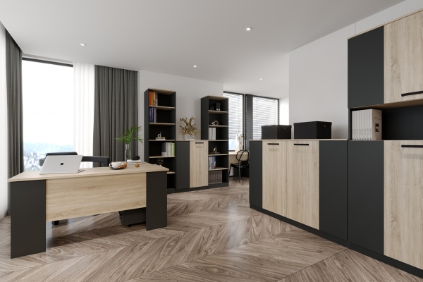 Стіл письмовий BIU100 Офіс Нью Gerbor – це естетичний шедевр, який дозволить вам створити організований та сучасний інтер'єр у домашньому кабінеті чи офісі. Універсальний письмовий стіл має досить велику робочу поверхню, що дозволить вільно розмістити на ньому ноутбук або комп'ютер, і залишиться достатньо місця для виконання іншої роботи. Стіл привертає увагу: неповторним стилем із строгою геометрією форм; контрастним поєднанням темного антрациту зі світлим деревом дуб cонома, надаючи колекції незвичайного характеру; міцними боковинами, що сприяють максимальній стійкості. Завдяки оригінальним та функціональним рішенням меблі Офіс Нью Gerbor ідеально впишуться в офісний простір.