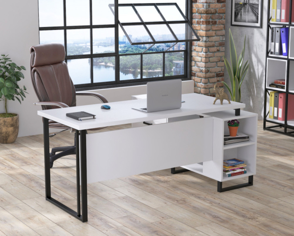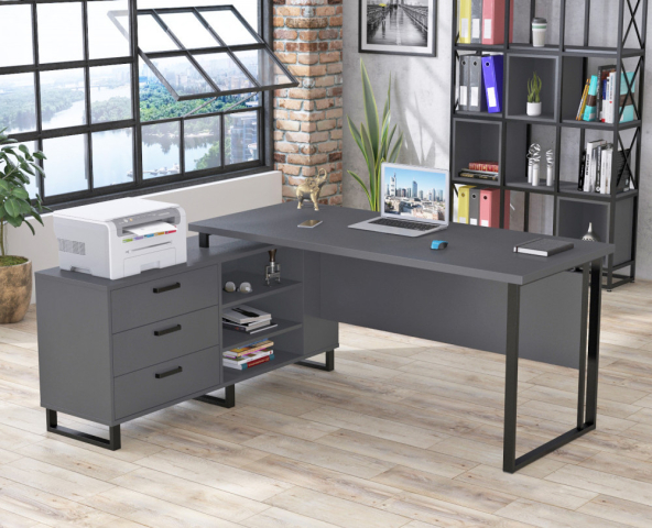 Стіл керівника Нотаріус - це справжній витвір мистецтва у світі офісних меблів. На вбудованій тумбі можна розмістити необхідну для роботи оргтехніку. Для документів, папок і особистих речей є відкриті полички, а також місткі висувні шухляди. З торця тумби зроблені відкриті ніші, в яких ви зможете розмістити будь-який декор або друковану продукцію. Завдяки такій конструкції столу у вас завжди все буде під рукою. Стіл керівника Нотаріус може бути виготовлений як з лівосторонньою тумбою, так і з правосторонньою.