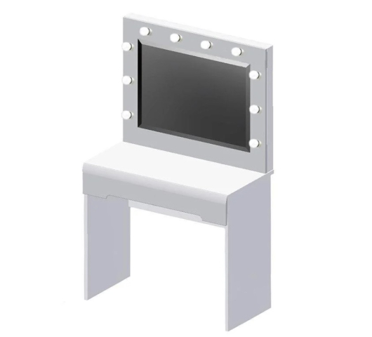 Елегантний стіл візажиста ВМК (БРВ) у класичному стилі - незамінний елемент меблів для жіночої кімнати та ідеальне місце для щоденного догляду за собою. Столик оснащений однією висувною шухлядою з перегородками, які чудово підійдуть для зберігання парфумів, косметики, дрібних аксесуарів та інших необхідних предметів. Корпус виконано з якісного ламінованого ДСП, фасади з якісного ламінованого МДФ у благородному білосніжному кольорі «німфея альба» з глянсовим покриттям, що надає меблям витонченості та свіжості. Дизайн привертає увагу класичним рішенням з витонченим фрезеруванням на нижній частині фасадів, яке замінює традиційні ручки, зберігаючи чистоту ліній. Столик має міцну конструкцію зі стійкою основою, що гарантує довговічність і комфорт у використанні. Фірмові комплектуючі забезпечують бездоганну функціональність і надійність. Стіл візажиста стане не тільки практичним помічником, а й стильною прикрасою інтер'єру, що створює атмосферу затишку і гармонії.