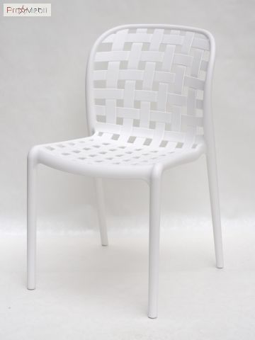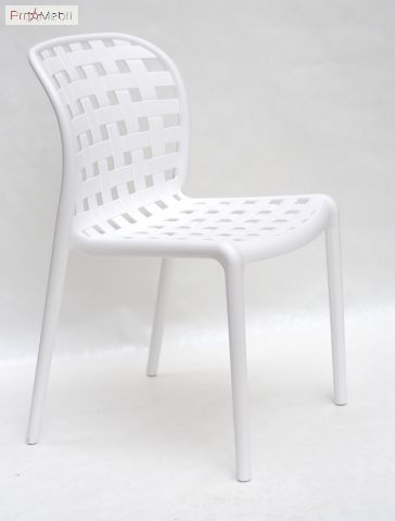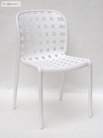 Стілець Gari білий 07 Onder Mebli - зручний стілець зі спинкою. Виготовлений в Малайзії. Представлений в різних кольорах. Стильний, оригінальний стілець з вигнутою спинкою у вигляді плетеного квадрата. Призначений для використання в житловому інтер'єрі, дачі, відкритих майданчиках, кафе, терасах.
