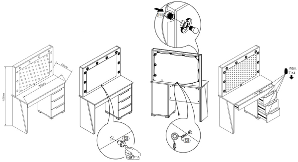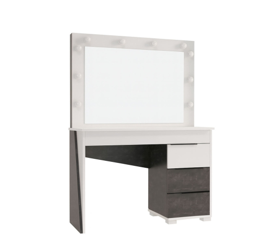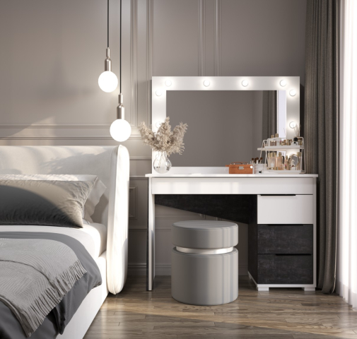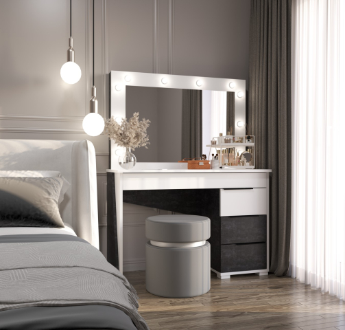 Туалетний столик Тоня Світ Меблів - сучасний акцент в інтер'єрі, де стиль і функціональність гармонійно поєднуються. Лаконічні лінії, велике дзеркало з підсвічуванням і контраст відтінків створюють атмосферу салонної елегантності, додаючи в повсякденні ритуали відчуття затишку і впевненості. Столик виконаний в ніжному кольорі німфея альба, який візуально освіжає простір, а темні вставки під бетон надають конструкції глибину і виразність. Широка стільниця зручна для розміщення косметики та аксесуарів, а чотири висувні ящики забезпечують порядок і комфортне зберігання всього необхідного. Велике дзеркало з підсвічуванням по периметру створює м'яке, рівномірне освітлення - ідеальне для макіяжу і догляду за собою. Туалетний столик Тоня Світ Меблів - простір краси і натхнення, де кожна деталь працює на відчуття гармонії і стилю.
