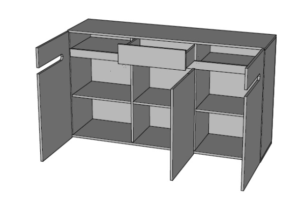 комод має три відділення за дверцятами, внутрішній простір за якими розділений поличками, і одну висувну шухлядку |