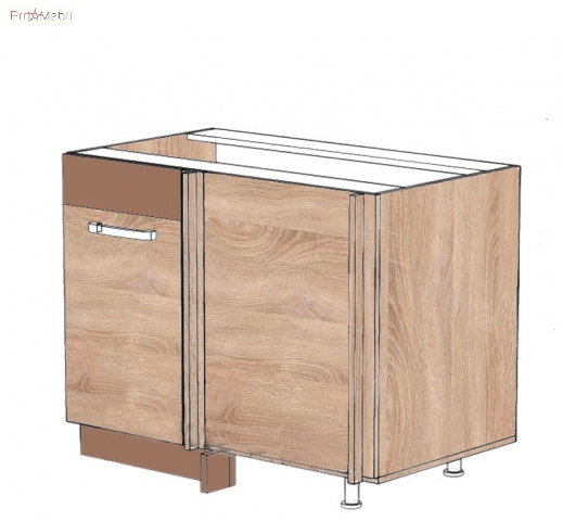 Функціональна і містка нижня кутова тумба КН100x60 Аліна Сокме чудово підійде для зберігання важких і об'ємних речей - всього того, що складно діставати з верхніх полиць. Тумба нижня з однією дверкой і глухим фасадом, містить одне закрите відділення з полицею всередині, для зберігання каструль різного розміру, сковорідок, кухонної техніки (наприклад, комбайну або соковитискача) і інших великогабаритних і важких предметів. Для зручності дверцята можуть навішуватися як з правого боку, так і з лівого. Стільниця комплектується та продається окремо. Корпус і фасади виготовляються з якісного ДСП товщиною 16 мм в цікавому поєднанні кольорів: корпус виконаний в кольорі «дуб сонома» максимально наближеному до текстури натуральної деревини з контрастними кавовими ставками в кольорі «лате». Торцеві поверхні всіх внутрішніх і зовнішніх елементів виробів облицьовані крайкою ABS товщиною 0,5/1 мм, надаючи меблям завершений гарний і доглянутий вигляд. Колекція привертає увагу сучасним дизайном; незвичайними відтінками; довгастими пластиковими ручками, сріблястого кольору; міцними ніжками, що сприяють максимальної стійкості з цокольними планками, які комплектуються силіконовим профілем, запобігаючи потрапляння вологи і бруду; фірмовими комплектуючими: роликовими напрямними GTV і завісами без дотягу Hafele, які забезпечують максимальний комфорт у використанні. Кухня Аліна Сокме - естетична і ергономічна, стане родзинкою і улюбленим місцем, де вам буде приємно проводити час.