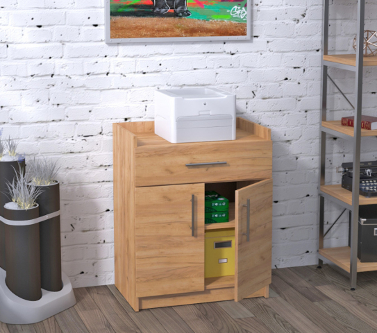 Тумба під принтер L-640 від виробника Loft Design - універсальна і практична модель. Вона може використовуватися як тумба під принтер, під кави-машину або просто для канцелярських товарів. У місткий ящик можна скласти дрібні канцтовари: ручки, зошити блокноти, файли, а в нижні відділення покласти коробки з офісної папером, папки з файлами та інші великі предмети. У разі використання тумби в якості підставки під кави-машину, в верхньому ящику зазвичай ховають гуртки, банки з кавою, чай, тарілки і ложки. Тумба виконана з преміального ЛДСП серії Wood товщиною листа 18 мм. Краї ЛДСП проклеєні кромкою 0,5 і 2 мм на німецькому обладнанні, використання якого дозволяє якісно клеїти крайку, тим самим збільшуючи термін експлуатації виробу. У даній моделі використовуються якісні металеві ручки 128 мм. До нижньої частини тумби для принтера кріпляться пластикові прокладки для захисту підлогового покриття. Шухляда кріпиться за допомогою роликових напрямних 35 см класу Люкс. Дверцята кріпляться на металеві петлі. Акуратна і компактна, тумба для принтера відмінно впишеться в дизайн сучасного офісу. Шухляда має розмір на всю ширину тумби. У відділенні, закритому двома дверцятами присутній поличка, що розділяє внутрішній простір тумби на дві зони. Полку може встановлюватися в двох положеннях: посередині простору або ближче до верху.