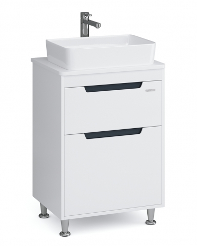 Тумба для ванної з умивальником 60 Rapid Greta Sanwerk чудово доповнить інтер’єр ванної кімнати і допоможе раціонально використовувати простір під раковиною і покращує естетичний вигляд в цілому. Тумба комплектується керамічним умивальником «Rapid», виробник «Quarter Bath», Туреччина, товщина умивальника - 110 мм, ширина - 500 мм, довжина - 350 мм, глибина - 85 мм. Стильна тумба має дві висувні шухляди, що дозволяє зберігати різну побутову хімію і господарські дрібниці. Корпус і фасади виготовлені з високоякісного МДФ товщиною 16 мм і пофарбовані фарбою італійського виробництва Sayerlack "білого" кольору з контрастними вставки кольору "темно-сірий графіт". Характерними особливостями меблів є фасади заглиблені в боковини, замість традиційних ручок для відкривання використовуються виїмки в фасаді, декоровані з внутрішньої сторони контрастною планкою, практичний сірий колір всередині шухляд, стійкі ніжки, фурнітура високої якості Blum (Австрія), що забезпечує плавне, м’яке закриття і довгу, надійну роботу всіх рухомих частин. Меблі Greta Sanwerk чудово впишуться в більшість інтер’єрів і всюди будуть виглядати органічно і сучасно.