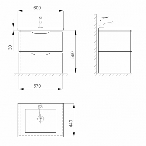 Тумба для ванної з умивальником 60 Space Line Alessa біла Sanwerk чудово доповнить інтер’єр ванної кімнати і допоможе раціонально використовувати простір під раковиною і покращує естетичний вигляд в цілому. Тумба комплектується керамічним умивальником «Space Line», виробник «Quarter Bath», Туреччина, товщина умивальника - 40 мм, глибина - 110 мм. Стильна тумба має дві висувні шухляди, що дозволяє зберігати різну побутову хімію і господарські дрібниці. Корпус і фасади виготовлені з високоякісного МДФ товщиною 16 мм і пофарбовані фарбою італійського виробництва Sayerlack в кольорі білий глянець, який ідеально впишеться в будь-який дизайн. Характерними особливостями меблів є подвійні боковини в корпусі, замість традиційних ручок для відкривання використовуються виїмки в фасаді, практичний сірий колір всередині шухляд, підвісний монтаж - кріплення до стіни Camar (Італія), фурнітура високої якості Blum (Австрія), що забезпечує плавне, м’яке закриття і довгу, надійну роботу всіх рухомих частин. Меблі Alessa Air Sanwerk чудово впишуться в більшість інтер’єрів і всюди будуть виглядати органічно і сучасно.