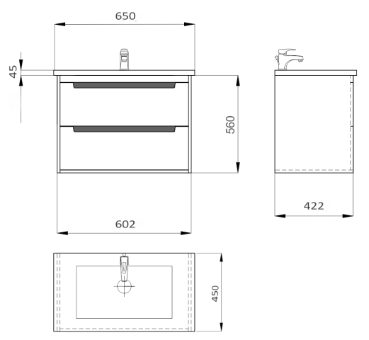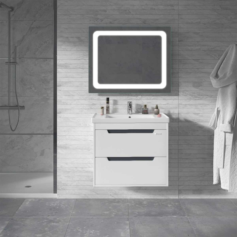 Тумба для ванної з умивальником 65 Idea Greta Air Sanwerk чудово доповнить інтер’єр ванної кімнати і допоможе раціонально використовувати простір під раковиною і покращує естетичний вигляд в цілому. Тумба комплектується керамічним умивальником «Idea 2.0», виробник «Kale Seramik», Туреччина, товщина умивальника - 45 мм, глибина - 135 мм. Стильна тумба має дві висувні шухляди, що дозволяє зберігати різну побутову хімію і господарські дрібниці. Корпус і фасади виготовлені з високоякісного МДФ товщиною 16 мм і пофарбовані фарбою італійського виробництва Sayerlack "білого" кольору з контрастними вставки кольору "темно-сірий графіт". Характерними особливостями меблів є фасади заглиблені в боковини, замість традиційних ручок для відкривання використовуються виїмки в фасаді, декоровані з внутрішньої сторони контрастною планкою, практичний сірий колір всередині шухляд, підвісний монтаж - кріплення до стіни Camar (Італія), фурнітура високої якості Blum (Австрія) , що забезпечує плавне, м’яке закриття і довгу, надійну роботу всіх рухомих частин. Меблі Greta Air Sanwerk чудово впишуться в більшість інтер’єрів і всюди будуть виглядати органічно і сучасно.