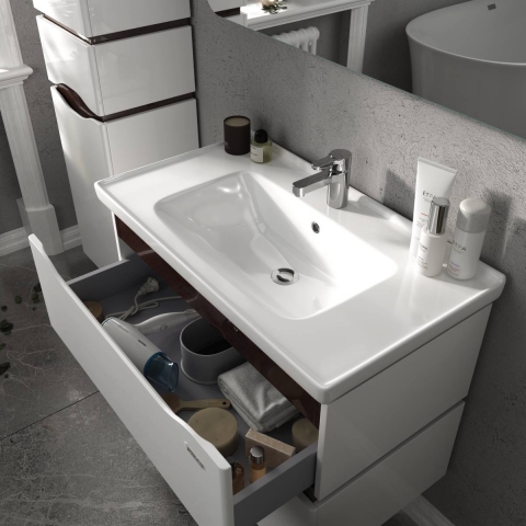 Тумба для ванної з умивальником 80 Idea Alessa венге Sanwerk чудово доповнить інтер’єр ванної кімнати і допоможе раціонально використовувати простір під раковиною і покращує естетичний вигляд в цілому. Тумба комплектується керамічним умивальником «Idea 2.0», виробник «Kale Seramik», Туреччина з бортиками по периметру, товщина умивальника - 45 мм, глибина - 135 мм. Стильна тумба має дві висувні шухляди, що дозволяє зберігати різну побутову хімію і господарські дрібниці. Корпус і фасади виготовлені з високоякісного МДФ товщиною 16 мм і пофарбовані фарбою італійського виробництва Sayerlack в кольорі "білого глянцю" з контрастними вставки в кольорі "венге". Характерними особливостями меблів є подвійні боковини в корпусі, замість традиційних ручок для відкривання використовуються виїмки в фасаді, декоровані з внутрішньої сторони контрастною планкою, практичний сірий колір всередині шухляд, стійкі ніжки, фурнітура високої якості Blum (Австрія), що забезпечує плавне, м'яке закриття і довгу, надійну роботу всіх рухомих частин. Меблі Alessa венге Sanwerk створять неповторний образ і ексклюзивний дизайн вашої ванної кімнати.