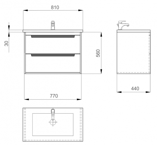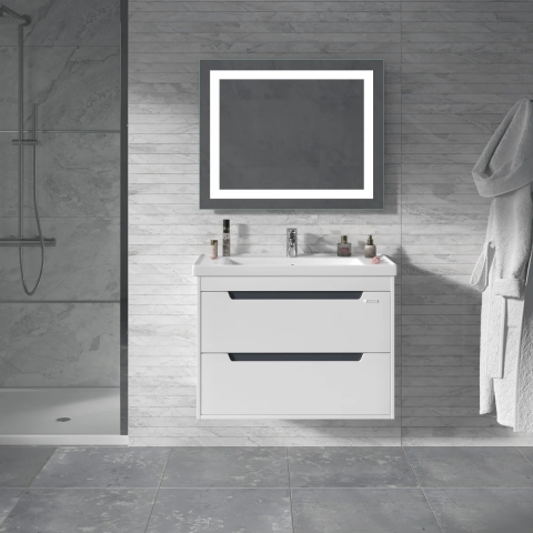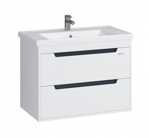 Тумба для ванної з умивальником 80 New Line Greta Air Sanwerk чудово доповнить інтер’єр ванної кімнати і допоможе раціонально використовувати простір під раковиною і покращує естетичний вигляд в цілому. Тумба комплектується керамічним умивальником «New Line», виробник «Quarter Bath», Туреччина, товщина умивальника - 40 мм, глибина - 100 мм. Стильна тумба має дві висувні шухляди, що дозволяє зберігати різну побутову хімію і господарські дрібниці. Корпус і фасади виготовлені з високоякісного МДФ товщиною 16 мм і пофарбовані фарбою італійського виробництва Sayerlack "білого" кольору з контрастними вставки кольору "темно-сірий графіт". Характерними особливостями меблів є фасади заглиблені в боковини, замість традиційних ручок для відкривання використовуються виїмки в фасаді, декоровані з внутрішньої сторони контрастною планкою, практичний сірий колір всередині шухляд, підвісний монтаж - кріплення до стіни Camar (Італія), фурнітура високої якості Blum (Австрія) , що забезпечує плавне, м’яке закриття і довгу, надійну роботу всіх рухомих частин. Меблі Greta Air Sanwerk чудово впишуться в більшість інтер’єрів і всюди будуть виглядати органічно і сучасно.