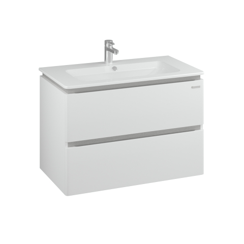 Тумба для ванної з умивальником 81 Падова Amata Air Sanwerk вишукано підкреслить інтер'єр ванної кімнати, дозволить раціонально використовувати простір під раковиною і додасть приміщенню витончений, сучасний вигляд. Тумба комплектується керамічним умивальником «Падова», виробник «Gala Ceramicas», Іспанія, з елегантними бортиками по периметру; товщина умивальника - 14 мм, глибина - 110 мм. Ефектна підвісна тумба оснащена двома висувними ящиками глибокого графітового відтінку, які забезпечать зручне зберігання побутової хімії та різних аксесуарів. Корпус виконаний з МДФ, а фасади з МДФ товщиною 19 мм в благородному «білому глянці» з декоративними вставками Renolit (Німеччина) «світло-сірого» тону з імітацією фарбованого шпону. Особливість серії полягає в гармонійному поєднанні прямих ліній фасадів з плавними заокругленнями, внутрішньому наповненні ящиків в кольорі темний графіт, масивних фасадах, декоративних вставках, а також відсутності звичних ручок - їх замінюють акуратні фрезеровані виїмки. Високоякісна фурнітура Blum (Австрія) забезпечує м'яке і безшумне закривання, а всі елементи розраховані на довгу і надійну експлуатацію. Колекція Аmata Air Sanwerk – стильний і функціональний гарнітур для ванної кімнати, який не залишить байдужим навіть найвибагливішого клієнта.