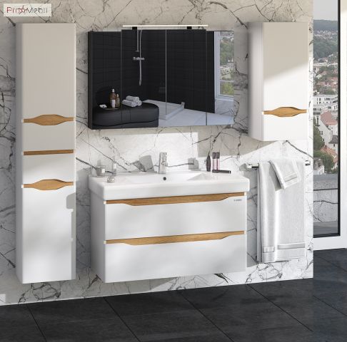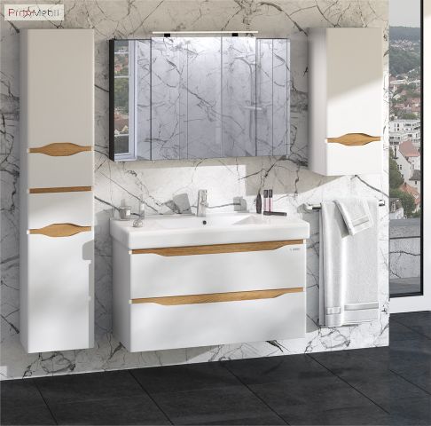 Тумба для ванної з умивальником 100 Принц Liga Sanwerk чудово доповнить інтер’єр ванної кімнати і допоможе раціонально використовувати простір під раковиною і покращує естетичний вигляд в цілому. Тумба комплектується керамічним умивальником «Принц», виробник «Sanwerk», Україна, товщина умивальника - 90 мм, глибина - 180 мм. Стильна тумба має дві висувні шухляди, що дозволяє зберігати різну побутову хімію і господарські дрібниці. Корпус і фасади виготовлені з високоякісного МДФ товщиною 16 мм і пофарбовані фарбою італійського виробництва Sayerlack "білого" кольору з контрастними вставки світлого дерева Renolit в кольорі "мессіна". Характерними особливостями меблів є поєднання прямих фасадів з заокругленнями на них, замість традиційних ручок для відкривання використовуються виїмки в фасаді, декоровані з внутрішньої сторони контрастною планкою, практичний сірий колір всередині шухляд, підвісний монтаж - кріплення до стіни Camar (Італія), фурнітура високої якості Blum (Австрія), що забезпечує плавне, м'яке закриття і довгу, надійну роботу всіх рухомих частин. Меблі Liga Air Sanwerk додадуть легкості, створять неповторний образ і ексклюзивний дизайн вашої ванної кімнати.