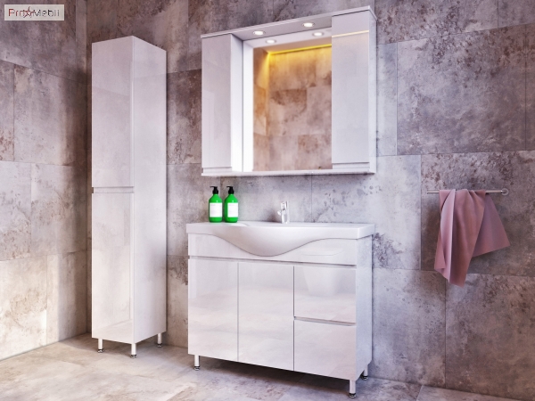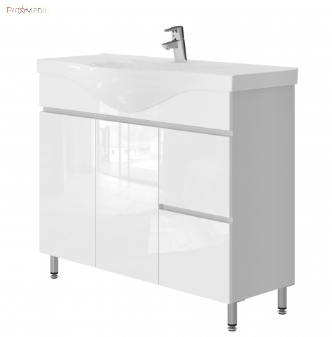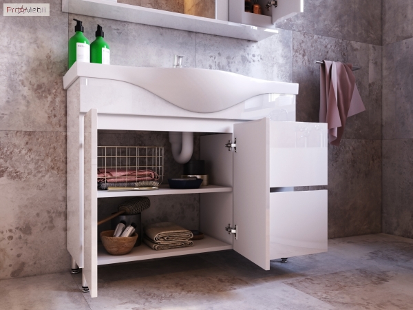 Тумба для ванної з умивальником M5-95 Моніка в кольорі білий глянець з колекції меблів для ванної кімнати Моніка української фабрики Ювента. Практична і функціональна підлогова тумба з керамічним умивальником має одні дверцята, внутрішній простір за якою поділено полицею, і дві висувні шухляди. Головною особливістю є прості геометричні форми, глянцеве покриття фасадів, відсутність ручок їх функцію виконують вифрезерувані на фасадах виїмки, хромовані ніжки, а також якісна і надійна фурнітура забезпечує надійність і довговічність у використанні. У конструкції передбачено отвір для підведення зливу за європейськими стандартами. Моніка Ювента - нове дизайнерське рішення, в якому простота поєднується з елегантністю.