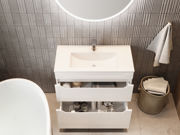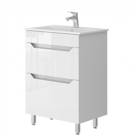 Стильна і сучасна тумба для ванної з умивальником N-60 біла Neo Ювента, що вражає своїм легким і сучасним дизайном, доповнить інтер'єр ванної кімнати і допоможе раціонально використовувати простір під раковиною і покращує естетичний вигляд в цілому. Тумба комплектується керамічним умивальником «Practico-60», виробник «Sanovit», Туреччина і має дві висувні шухляди, висота верхньої шухляди 25 см, висота нижньої шухляди 34 см, що дозволяє зручно розкласти всілякі гелі, креми, рушники та інші речі, заховати побутову хімію, приховуючи їх від оточуючих. Характерними особливостями меблів є оригінальний дизайн і функціональність; бездоганність форм; мінімальне декоративне оформлення; поєднання білого корпусу та білих глянцевих фасадів; відсутність ручок, їхню роль виконують фрезеровані на фасаді виїмки; підлоговий монтаж, встановлюється на чотири хромовані ніжки (висота ніжок 10 см), а також є додаткове кріплення до стіни; напрямні з функцією самодотягування часткового висування, виробник "Hettich", що забезпечує плавне та м'яке закривання. Меблі Neo Juventa дозволять надати приміщенню неповторної атмосфери, а Ви зможете з самого ранку подарувати собі гарний настрій.