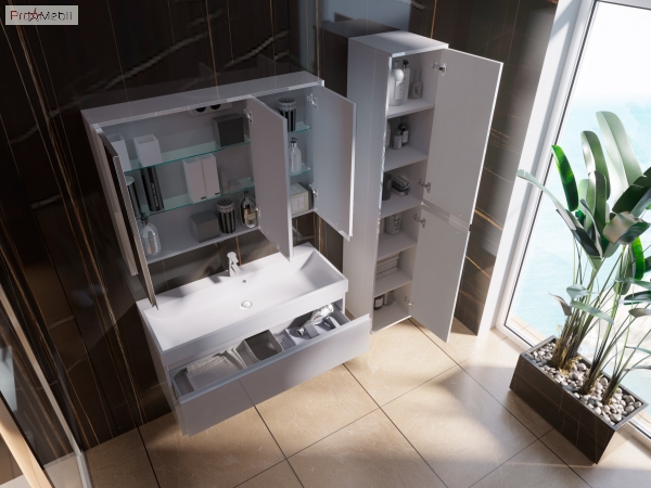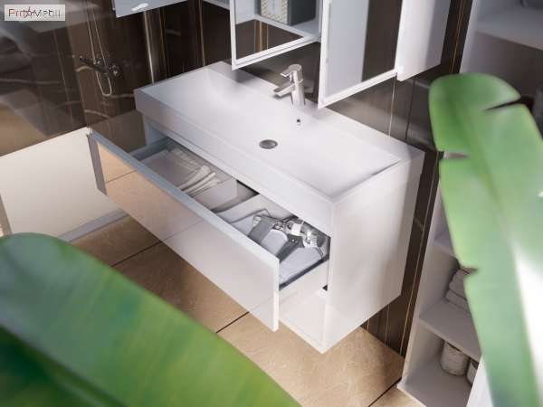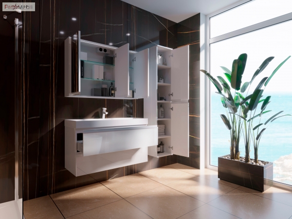Тумба для ванної з умивальником Sv-100 Savona Ювента гарно доповнить інтер'єр ванної кімнати і допоможе раціонально використовувати простір під раковиною і покращує естетичний вигляд в цілому. Тумба комплектується умивальник зі штучного каменю «Varna-100», виробник «Укркомпозит», Україна і має дві висувні шухляди з металевими боковинами, які дозволяють зручно розкласти всілякі гелі, креми, рушники та інші речі, заховати побутову хімію, приховуючи їх від оточуючих. Корпус виготовлений з ламінованого ДСП товщиною 16 мм, а фасадні частини виготовлені з ламінованого ДСП товщиною 18 мм. Дно шухляд виготовлене з ДСП товщиною 16 мм, колір «білий». Поверхня меблів покрита високоглянцевою емаллю білого кольору. В конструкції передбачено загальноприйняте та гармонізоване з усіма європейськими стандартами підведення та відведення води. Характерними особливостями меблів Savona Ювента є прості геометричні форми; глянцеве покриття корпусів і фасадів; ручки, зроблені з алюмінієвого профілю, пофарбовані в білий колір; підвісний монтаж - кріплення до стіни; приховані направляючі з функцією самодотягування повного висування типу «InnoTech», виробник «Hettich», які забезпечують плавне і м'яке закривання. Савона Ювента - сучасний гарнітур для ванної кімнати, який не залишить байдужим навіть найвибагливішого клієнта.