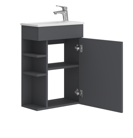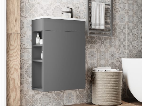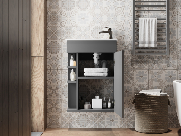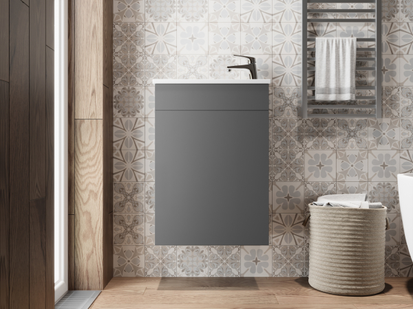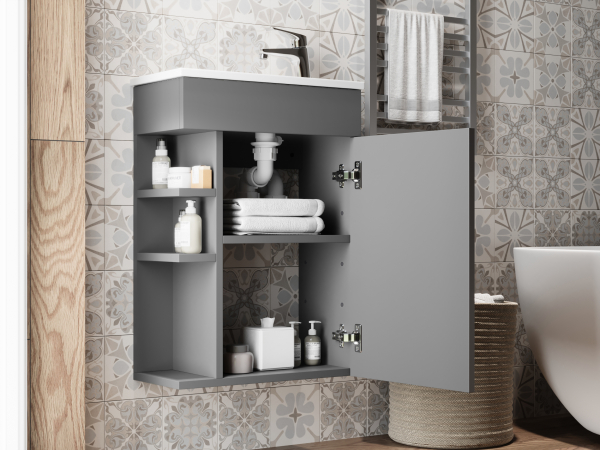 Вишукана і функціональна тумба для ванної з умивальником T-50 антрацит Amadeo Ювента, створена для тих, хто цінує гармонійне поєднання стилю, комфорту і практичності в оформленні ванної кімнати. Підвісна тумба комплектується керамічним умивальником «Atria-50», виробником «Sanovit», Туреччина і має відкриті полиці і одне закрите відділення з полицею всередині, де зручно розмістити гелі, креми, рушники та інші приналежності. Меблі привертають увагу сучасним дизайном в стилі мінімалізму, де кожна деталь продумана для максимального комфорту; глибоким і благородним антрацитовим матовим відтінком, який привносить в інтер'єр нотки сучасного шику, строгості і витонченої елегантності; відсутністю звичних ручок, функцію яких виконує акуратно оформлений торець фасадів, що надає меблям лаконічність і витончений вигляд; підвісним монтажем конструкції, що забезпечує легкість візуального сприйняття і допомагає економити простір; якісними петлями «GTV», що гарантують м'яке і безшумне закриття дверцят, продовжуючи термін служби виробу. Amadeo Ювента гармонійно впишеться в інтер'єр і підкреслить сучасний стиль ванної кімнати.