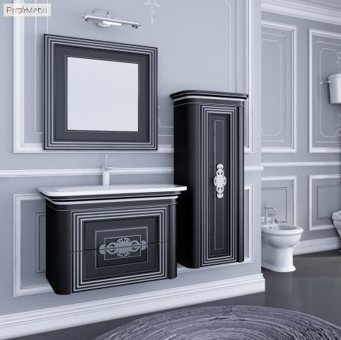 Тумба для ванной подвесная с умывальником Т-80 черная Treviso в цвете черный матовый (патина серебро) из коллекции мебели для ванной комнаты Treviso украинской ТМ Botticelli. Подвесная тумба с умывальником из искусственного камня имеет два выдвижных ящичка с металлическими боковинами. Главной особенностью являются классический дизайн, строгость и сдержанность цветовой гаммы выгодно сочетаются с легкостью и невесомостью контуров мебели, дизайн обогащен элементами декора, которые, что важно, не портят, а подчеркивают ее изысканность, матовое покрытие корпусов и фасадов с нанесением патины и красивые ажурные ручки из нержавеющей стали. Качественная направляющие InnoTech с функцией самодотягивания полного выдвижения обеспечивают плавное мягкое закрытие. В конструкции предусмотрен подвод и отвод воды по европейским стандартам.