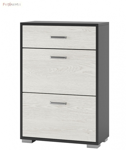 Висока тумба для взуття аляска Світ Меблів - незамінна супутниця інтер'єру передпокою, яка допоможе організувати систему зберігання повсякденного взуття, звільнивши простір і прикрасивши інтер'єр. Тумба містить два закритих відділення з відкидними дверцятами, що дозволяє розмістити велику кількість чобіт, туфель, босоніжок та іншого взуття, а також одну висувну шухляду для необхідних дрібниць. Корпус і фасадні частини виготовляються з високоякісного ламінованого ДСП в поєднанні світлих фасадів в кольорі аляска з темним антрацитовим корпусом. Тумба привертає увагу продуманим до дрібниць дизайном; поєднанням світлих і темних відтінків; якісними пластиковими ручками довгастої форми; стійкими ніжками; фірмовими комплектуючими. Тумба для взуття Світ Меблів комфортна і містка, є відмінною системою зберігання.