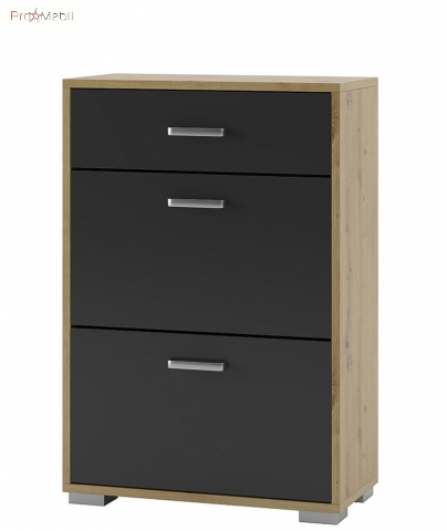 Висока тумба для взуття антрацит Світ Меблів - незамінна супутниця інтер'єру передпокою, яка допоможе організувати систему зберігання повсякденного взуття, звільнивши простір і прикрасивши інтер'єр. Тумба містить два закритих відділення з відкидними дверцятами, що дозволяє розмістити велику кількість чобіт, туфель, босоніжок та іншого взуття, а також одну висувну шухляду для необхідних дрібниць. Корпус і фасадні частини виготовляються з високоякісного ламінованого ДСП в поєднанні антрацитових фасадів з корпусом деревної текстури дуба артізан. Тумба привертає увагу продуманим до дрібниць дизайном; поєднанням світлих і темних відтінків; якісними пластиковими ручками довгастої форми; стійкими ніжками; фірмовими комплектуючими. Тумба для взуття Світ Меблів комфортна і містка, є відмінною системою зберігання.