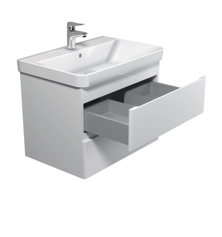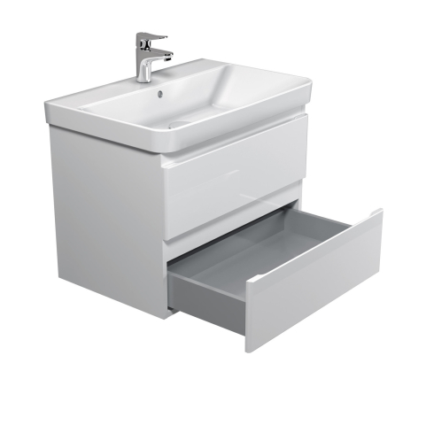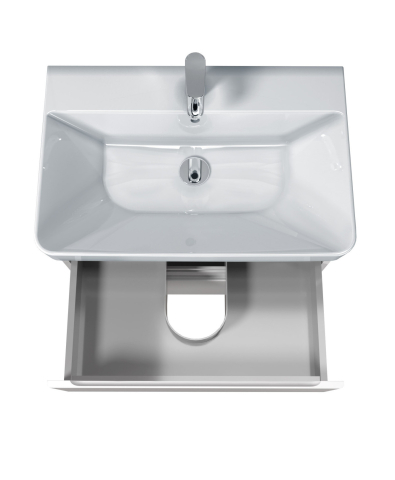 Тумба для ванної з умивальником 70-A (Vivace 70) Unik Мойдодир — створена для тих, хто прагне до гармонійного і стильного оформлення інтер'єру ванної кімнати. Тумба комплектується порцеляновим умивальником «Vivace-70», виробник Туреччина, і має дві висувні шухляди, що дозволяє зручно розмістити все необхідне: від косметики і рушників до побутової хімії, зберігши акуратність і порядок у ванній кімнаті. Корпус виготовлений з міцної ДСП Kronospan товщиною 16 мм, фасади виконані з МДФ Kronospan товщиною 16 мм, в благородному кольорі білий глянець, який візуально розширює простір, освіжає інтер'єр і органічно поєднується з дизайнами будь-якої спрямованості — від лаконічного сучасного до елегантного класичного. Особлива увага в колекції приділена виразним деталям: лаконічний, стриманий дизайн без нав'язливого декору, відсутність традиційних ручок — замість них акуратні фрезеровані виїмки на фасадних частинах; підвісний монтаж, що надає легкість і легкість конструкції; а також використання першокласної фурнітури — напрямних Hettich, що забезпечують плавне, безшумне закривання. Завдяки колекції Unik Мойдодыра ви з легкістю створите атмосферу затишку, врівноваженості і комфорту — ту саму ванну, в яку хочеться повертатися знову і знову.