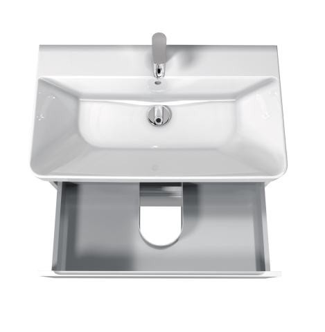 Тумба для ванної з умивальником 80-A (Vivace 80) Unik Мойдодир — створена для тих, хто прагне до гармонійного і стильного оформлення інтер'єру ванної кімнати. Тумба комплектується порцеляновим умивальником «Vivace-80», виробник Туреччина, і має дві висувні шухляди, що дозволяє зручно розмістити все необхідне: від косметики і рушників до побутової хімії, зберігши акуратність і порядок у ванній кімнаті. Корпус виготовлений з міцної ДСП Kronospan товщиною 16 мм, фасади виконані з МДФ Kronospan товщиною 16 мм, в благородному кольорі білий глянець, який візуально розширює простір, освіжає інтер'єр і органічно поєднується з дизайнами будь-якої спрямованості — від лаконічного сучасного до елегантного класичного. Особлива увага в колекції приділена виразним деталям: лаконічний, стриманий дизайн без нав'язливого декору, відсутність традиційних ручок — замість них акуратні фрезеровані виїмки на фасадних частинах; підвісний монтаж, що надає легкість і легкість конструкції; а також використання першокласної фурнітури — напрямних Hettich, що забезпечують плавне, безшумне закривання. Завдяки колекції Unik Мойдодыра ви з легкістю створите атмосферу затишку, врівноваженості і комфорту — ту саму ванну, в яку хочеться повертатися знову і знову.