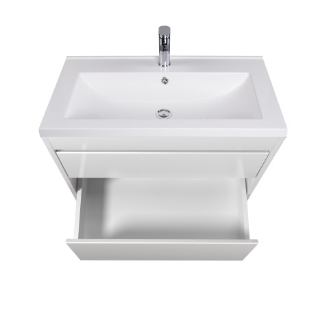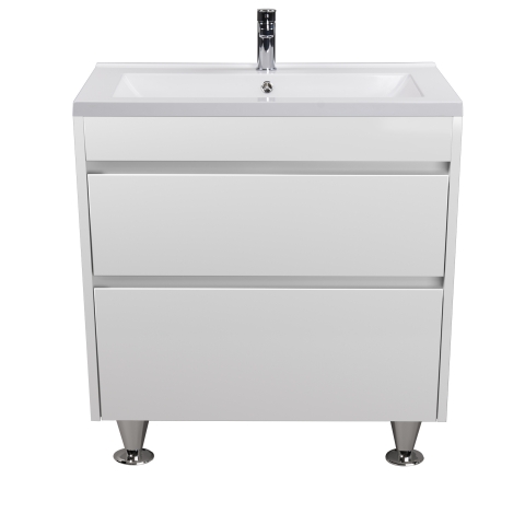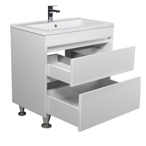 Тумба для ванної з умивальником 80-U Cosmo Prime Мойдодир гарно доповнить інтер'єр ванної кімнати і допоможе раціонально використовувати простір під раковиною і покращує естетичний вигляд в цілому. Тумба комплектується умивальником із штучного камня «Cosmopolitan-80», виробник «TM Amidicon», Україна і має дві висувні шухляди, які дозволяють зручно розкласти всілякі гелі, креми, рушники та інші речі, заховати побутову хімію, приховуючи їх від оточуючих. Корпус виготовляється з ламінованого ДСП товщиною 16 мм, фасади з МДФ товщиною 16 мм. Меблі для ванної Прайм Мойдодир виконані в класичному білому кольорі, який ідеально впишуться в будь-який дизайн. Характерними особливостями меблів Prime Moidodir є лаконічність і функціональність; бездоганність форм; мінімальне декоративне оформлення; цікаве дизайнерське рішення: відсутність ручок, їх роль виконують фрезеровані на фасаді виїмки; фірмові комплектуючі: направляючі виробництва «Hettich», які забезпечують плавне і м'яке закривання. Меблі Prime Мойдодир дозволять зробити простір ванної кімнати максимально комфортним і створять затишок у Вашій ванній кімнаті.