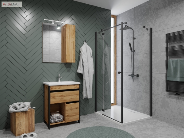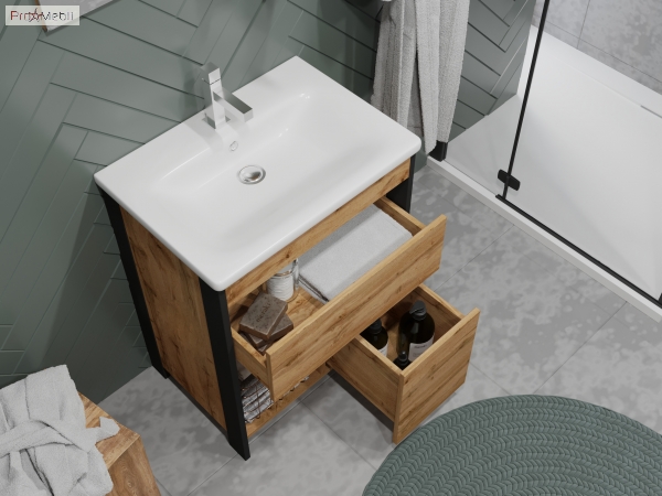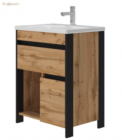 Тумба для ванної з умивальником Brx-65 Bronx Ювента чудово доповнить інтер'єр ванної кімнати і допоможе раціонально використовувати простір під раковиною і покращує естетичний вигляд в цілому. Тумба комплектується керамічним умивальником «Soft-65», виробник «Sanovit», Туреччина і має дві висувні шухляди, а також нішу з лівого боку, це дозволить зручно розкласти всілякі гелі, крема, рушники та інші речі, заховати побутову хімію, приховуючи їх від оточуючих. Ви можете укомплектувати тумбу сифоном «Нептун» Н0410, який ідеально підходить для відводу води у відповідності з особливостями конструкції тумби. Корпус і фасад виготовлені з високоякісного ламінованого ДСП товщиною 16 мм, в оригінальному поєднанні декоративних чорних планок з контрастною дерев'яною текстурою натурального відтінку «дуб вотан». Головною особливістю серії є стильний дизайн, зручні і місткі елементи, правильні геометричні форми, відсутність ручок їх функцію виконують вифрезерувані на фасадах виїмки, декоративні виразні контрастні планки - плавно переходять в ніжки виготовлені з сосни, направляючі з функцією самодотягування часткового висування, виробник «Hettich». Bronx Juventa це та практичність, функціональність, а також виразність форм і яскравість текстур, яка підкреслять оригінальний стиль інтер'єру і створять в будинку затишне оточення.