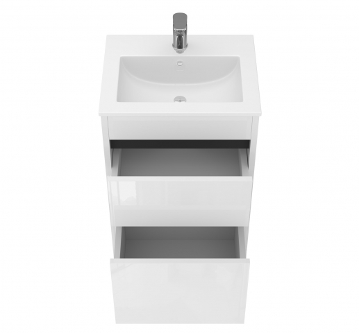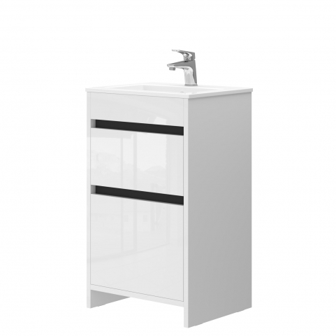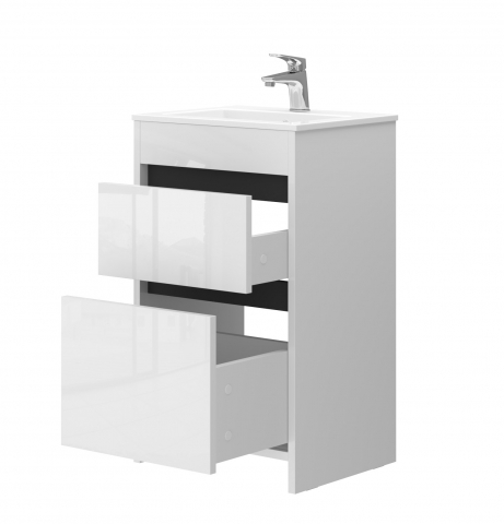 Сучасна тумба для ванної з умивальником Dt-50 Detmold Ювента з європейським дизайном чудово підійде для облаштування ванної кімнати. Компактна модель тумби дозволяє раціонально організувати простір під раковиною для зберігання побутової хімії та господарських речей та покращує естетичний вигляд загалом. Підлогова тумба комплектується керамічним умивальником «Practico-50», виробник «Sanovit», Туреччина і має у своїй конструкції дві висувні шухляди. Ви можете укомплектувати тумбу сифоном «Нептун» Н0410, який ідеально підходить для відводу води у відповідності з особливостями конструкції тумби. Тумба для ванної з умивальником привертає увагу сучасним європейським дизайном у стилі мінімалізму; зручними та місткими елементами; трендовою комбінацією білих глянцевих фасадів та чорних вставок; максимально зручними інтегрованими у фасад фрезерованими ручками; міцною основою, що сприяють максимальній стійкості; фірмовими напрямними з функцією самодотягування часткового висування, виробник «Hafele», які забезпечують плавне та м'яке закривання. Меблі Detmold Juventa стануть відмінним вибором і створять абсолютно індивідуальний дизайн у ванній кімнаті.