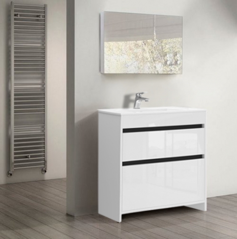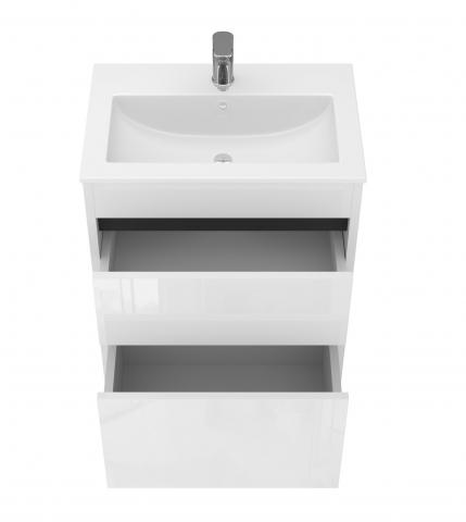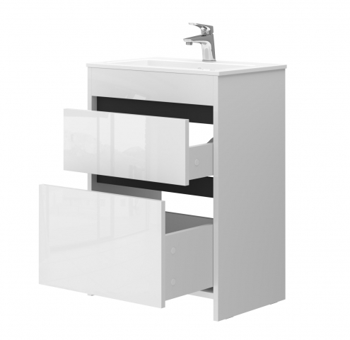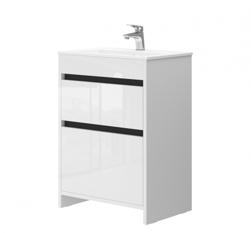 Сучасна тумба для ванної з умивальником Dt-60 Detmold Ювента з європейським дизайном чудово підійде для облаштування ванної кімнати. Компактна модель тумби дозволяє раціонально організувати простір під раковиною для зберігання побутової хімії та господарських речей та покращує естетичний вигляд загалом. Підлогова тумба комплектується керамічним умивальником «Practico-60», виробник «Sanovit», Туреччина і має у своїй конструкції дві висувні шухляди. Ви можете укомплектувати тумбу сифоном «Нептун» Н0410, який ідеально підходить для відводу води у відповідності з особливостями конструкції тумби. Тумба для ванної з умивальником привертає увагу сучасним європейським дизайном у стилі мінімалізму; зручними та місткими елементами; трендовою комбінацією білих глянцевих фасадів та чорних вставок; максимально зручними інтегрованими у фасад фрезерованими ручками; міцною основою, що сприяють максимальній стійкості; фірмовими напрямними з функцією самодотягування часткового висування, виробник «Hafele», які забезпечують плавне та м'яке закривання. Меблі Detmold Juventa стануть відмінним вибором і створять абсолютно індивідуальний дизайн у ванній кімнаті.