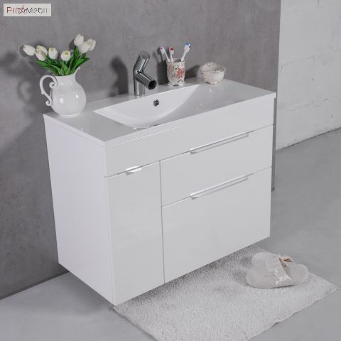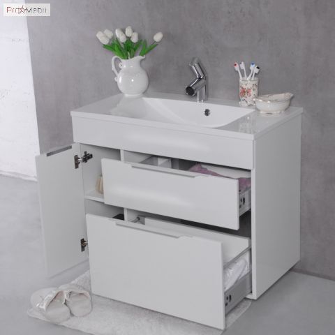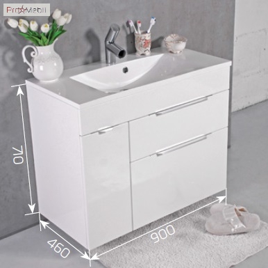 Тумба для ванної з умивальником Bermuda-2 Edison 900C Fancy Marble чудово доповнить інтер'єр ванної кімнати і допоможе раціонально використовувати простір під раковиною і покращує естетичний вигляд в цілому. Тумба комплектується прямокутним умивальником з широкими боковинами із литого штучного каменю моделі Edison 900C і має ві висувні шухляди і одне закрите відділення з полицею всередині, що дозволяє зберігати різну побутову хімію і господарські дрібниці. Для підвішування вмонтовано два регульованих навіси. Корпус і фасадні частини виготовлені з МДФ товщиною 16 мм, поверхня меблів покрита вологостійкою ПВХ-плівкою. Акуратна тумба виконана в класичному кольорі білий глянець, з можливістю виготовити в кольорі білий матовий і графіт матовий. Головною особливістю є динамічні лінії, прямокутні форми; металеві накладні ручки сріблястого кольору; система «Soft close», яка забезпечує плавне і м'яке закривання. Fancy Marble - уособлення по-справжньому високої якості, витонченого дизайну і відмінною функціональності.