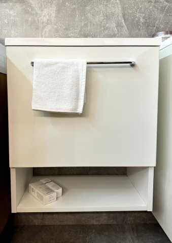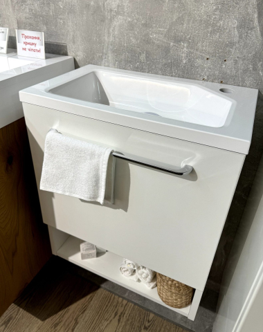 Тумба для ванної з умивальником Ion 500 Fancy Marble чудово доповнить інтер'єр ванної кімнати і допоможе раціонально використовувати простір під раковиною і покращує естетичний вигляд в цілому. Тумба комплектується умивальником з литого штучного каменю моделі Jessica 500 і має одне закрите відділення і відкриту нішу, що дозволяє зберігати різну побутову хімію і господарські дрібниці. Для підвішування вмонтовано два регульованих навіси. Корпус і фасадні частини виготовлені з ламінованого ДСП товщиною 16 мм, торцеві поверхні облицьовані крайкою ПВХ. Тумба може бути виконана в двох кольорах на вибір: білий платиновий або горіх барселона. Головною особливістю є динамічні лінії, прямокутні форми; довгасті металеві ручки; система «Soft close», яка забезпечує плавне і м'яке закривання. Fancy Marble - уособлення по-справжньому високої якості, витонченого дизайну і відмінною функціональності.