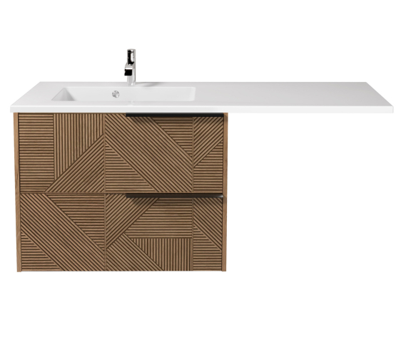 Тумба для ванної з умивальником підвісна з крилом над пральною машиною 80-A Adam 140 L Cubic Мойдодыр синонім елегантності та сучасності від українського виробника Мойдодыр, вона представляє вишукане і функціональне рішення для ванної кімнати, яке поєднує в собі інноваційний дизайн і функціональність, стане стильним і практичним рішенням для сучасної ванної кімнати і допоможе раціонально використовувати простір, особливо якщо в ній передбачена пральна машина. Тумба комплектується умивальником зі штучного каменю «Adam-140-L» шириною 140 см з лівим крилом, яке повністю закриває техніку, створюючи акуратний цілісний вигляд інтер'єру і одночасно забезпечуючи зручну робочу поверхню для косметики, аксесуарів або побутових дрібниць, а два висувних ящика дозволять зручно розкласти всілякі гелі, креми, рушники та інші речі, заховати побутову хімію, приховуючи їх від оточуючих. Характерними особливостями меблів є неперевершена елегантність; унікальний і вишуканий вигляд; унікальна геометрична мозаїка на фасадах; натуральний дерев'яний відтінок; чорні ручки, немов акценти в симфонії дизайну, додають вишуканості і сучасного шарму; підвісний монтаж - подарує відчуття легкості і повітряності, дозволяючи вам використовувати простір під, на свій розсуд; фірмові комплектуючі. Cubic Мойдодыр - унікальне поєднання стилю і практичності, створене для того, щоб перетворити ванну кімнату в простір комфорту і релаксації.