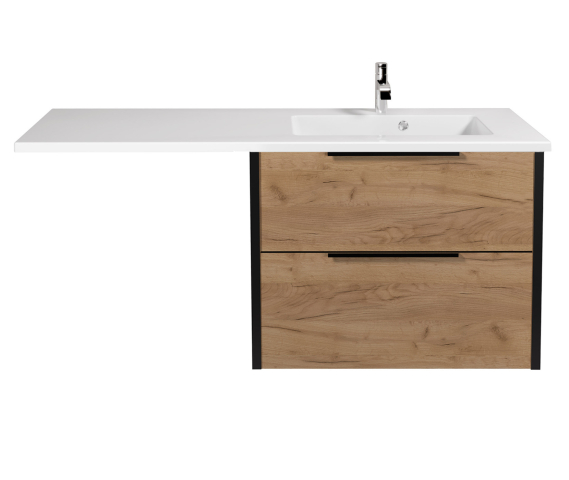 Стильна і сучасна тумба для ванної з умивальником підвісна з крилом над пральною машиною 80-A Adam 140 R Line Craft Мойдодир прекрасно доповнить інтер'єр ванної кімнати і стане стильним і практичним рішенням для сучасної ванної кімнати і допоможе раціонально використовувати простір, особливо якщо в ній передбачена пральна машина. Тумба комплектується умивальником зі штучного каменю «Adam-140-R» шириною 140 см із правим крилом, яке повністю закриває техніку, створюючи акуратний цілісний вигляд інтер'єру і одночасно забезпечуючи зручну робочу поверхню для косметики, аксесуарів або побутових дрібниць, а два висувних ящика дозволять зручно розкласти всілякі гелі, креми, рушники та інші речі, заховати побутову хімію, приховуючи їх від оточуючих. Характерними особливостями тумби Лайн Крафт Мойдодыр є оригінальний і сучасний дизайн; простота і вишуканість ліній; комбінація кольорів: натуральний деревний відтінок і контрастний чорний контур; зручні мініатюрні ручки, контрастного чорного кольору; підвісний монтаж; фірмові комплектуючі напрямні з доводчиками, виробництва «Hettich», які забезпечують плавне і м'яке закривання. Меблі Line Craft Мойдодыр наповнять ванну теплом і затишком, створюючи позитивний настрій на цілий день.