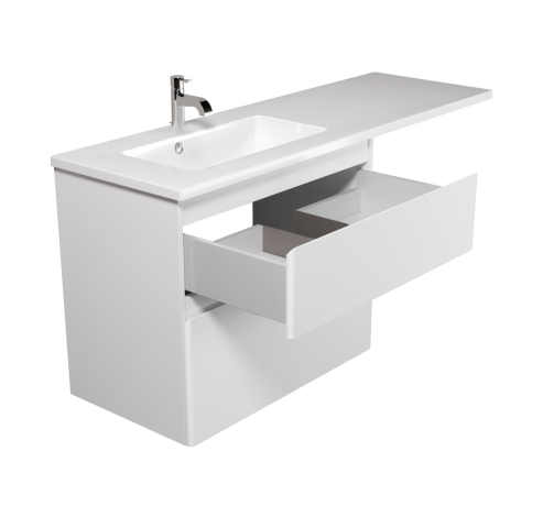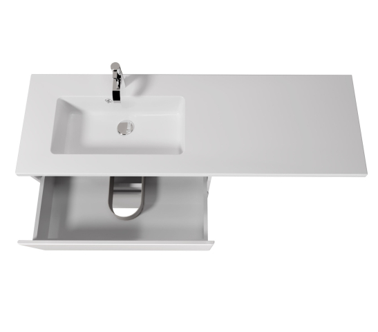 Тумба для ванної з умивальником підвісна з крилом над пральною машиною 80-U Adam 140 L Палермо Мойдодир стане стильним та практичним рішенням для сучасної ванної кімнати та допоможе раціонально використовувати простір, особливо якщо у ній передбачено пральну машину. Тумба комплектується умивальником зі штучного каменю «Adam-140-L» шириною 140 см із лівим крилом, яке повністю закриває техніку, створюючи акуратний цілісний вигляд інтер’єру та водночас забезпечуючи зручну робочу поверхню для косметики, аксесуарів чи побутових дрібниць, а дві висувні шухляди, що дозволить зручно розкласти всілякі гелі, крема, рушники та інші речі, заховати побутову хімію, приховуючи їх від оточуючих. Корпус виготовлений з міцного пофарбованого ДСП товщиною 16 мм, фасади – з вологостійкого МДФ Kronospan товщиною 19 мм, покритих ультрафіолетовою фарбою Iris (Іспанія), що гарантує захист від вологи та збереження бездоганного вигляду протягом багатьох років. Характерними особливостями меблів Палермо Мойдодир є вишуканий стиль; глянсовий блиск; гладка округленість кутів; тонкі лінії і плавні форми; відсутність ручок, їх роль виконують фрезеровані на фасаді виїмки; підвісний монтаж; фірмові комплектуючі: направляючі Hettich з плавним і безшумним закриванням. Вибравши комплект Палермо Мойдодир, Ви наповните ванну кімнату вишуканістю і функціональністю.