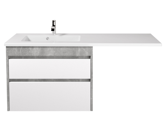 Ідеальна тумба для ванної з умивальником підвісна з крилом над пральною машиною 80-U Adam 140 L Polo Loft Мойдодир для поціновувачів таких стилів як скандинавський, лофт і хай-тек прекрасно доповнить інтер'єр ванної кімнати і допоможе раціонально використовувати простір, особливо якщо в ній передбачена пральна машина. Тумба комплектується умивальником зі штучного каменю «Adam-140-L» шириною 140 см з лівим крилом, яке повністю закриває техніку, створюючи акуратний цілісний вигляд інтер'єру і одночасно забезпечуючи зручну робочу поверхню для косметики, аксесуарів або побутових дрібниць, а два висувних ящика дозволять зручно розкласти всілякі гелі, креми, рушники та інші речі, заховати побутову хімію, приховуючи їх від оточуючих. Корпус виготовляється з вологостійкого ламінованого ДСП Kronospan (Польща) товщиною 18 мм з фасадами з ДСП Kronospan (Польща) товщиною 16 мм покритими вологостійкою фарбою ультрафіолетового твердіння Iris (Іспанія), що забезпечує стійкість до впливу вологи і довговічність, в сучасному колірному поєднанні бетон / білий глянцевий. Головною особливістю серії Polo Loft Мойдодыр є актуальний дизайн у простій формі; незвичайні і функціональні естетичні рішення і максимальна зручність використання; відсутність ручок, їх роль виконують фрезеровані на фасаді виїмки; підвісний монтаж; фірмові комплектуючі: напрямні Hettich з плавним закриванням, що забезпечують плавне і м'яке закривання. Поло Лофт Мойдодыр відмінно впишеться в інтер'єр, роблячи вашу ванну кімнату елегантною і функціональною.